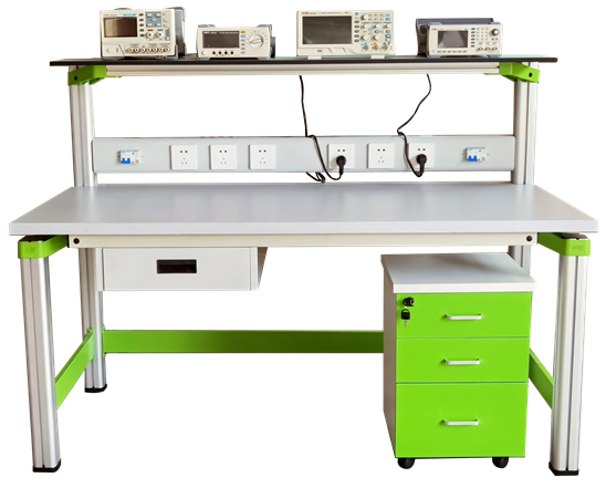 实训桌规格为1600(长)*700(宽)*1350(高),设有二个抽屉;实验桌主体结构全部采用高性能表面氧化的铝型材及一次成型铝压铸框架连接构件,连接构件采用压铸成型工艺(非焊接工艺),经机加工、抛丸、喷砂,表面静电喷涂工艺,安装方便、快捷,用户可自行DIY组装。桌体立柱采用工业铝型材成型工艺,表面氧化处理,截面尺寸:70mm×70mm,四面带槽,槽宽约8mm,端部装有注塑成型配套塑料堵头。桌面采用25mm三聚氰胺饰面板,配有一块防静电绝缘皮。贴桌面板下设支撑框架,承受力不少于200kg。配备储存柜,存放元件及工具,储存柜底部4只高强度万向可制动PU脚轮,方便移动。实训装置整体简约不简单,高端大气,符合现代化产品审美和发展趋势。