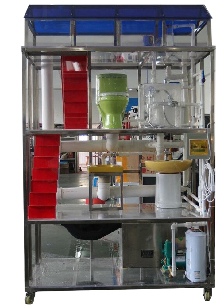 排水系统中每段横管、用于测定排水系统中各点的系统给水来自一层水池,水泵从水池抽水送入顶层水箱,在水泵的出水管上设有截止阀,以便控制系统的给水出水压力,实验装置的各层均设有卫生设备(洗脸盆、坐便器、浴盆等),在排水管道的节点处分别设置了等径三通、异径三通、异径斜三通、等连接配件,在伸顶用于控制排水立管的通水量。