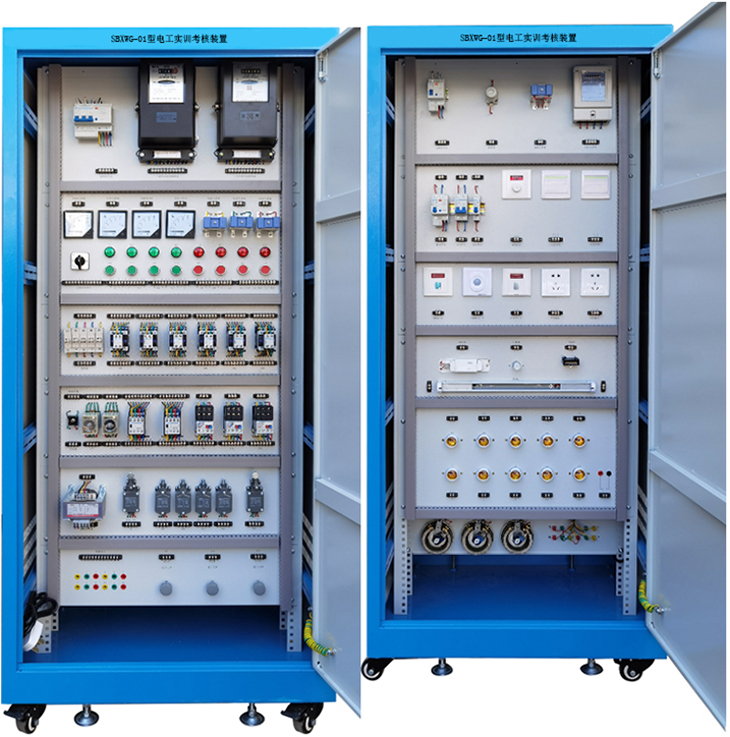 该设备按照标准电气控制柜设计制造(规格:800×600×1800mm),利用双面空间位置,柜内装有完成各种照明电路所需的单相电度表、日光灯、白炽灯、单联开关、感应开关、声控开关、触摸开关、插座等,以及电气控制所需要的多种低压电器,如漏电断路器、熔断器、电流互感器、接触器、中间继电器、时间继电器、热继电器、行程开关、按钮、信号灯、转换开关、电压表、电流表以及三相四线有功电度表等。为了延长电器的使用寿命,降低材料消耗,各电器的接点都已与接线端子相连,学生只需在接线端子上接线训练,以求电气元件经久耐用。技训柜还配备多台附属电机,通过该电动机支持可作各种实验。