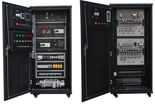 1.本装置是由控制柜、受控对象等组成一个完整系统,具有占地面积小、操作方便、可移动、内部安装有照明设施、操作面板,各控制点和通讯接口均引出到专用的接线板上,使实训更加便捷。